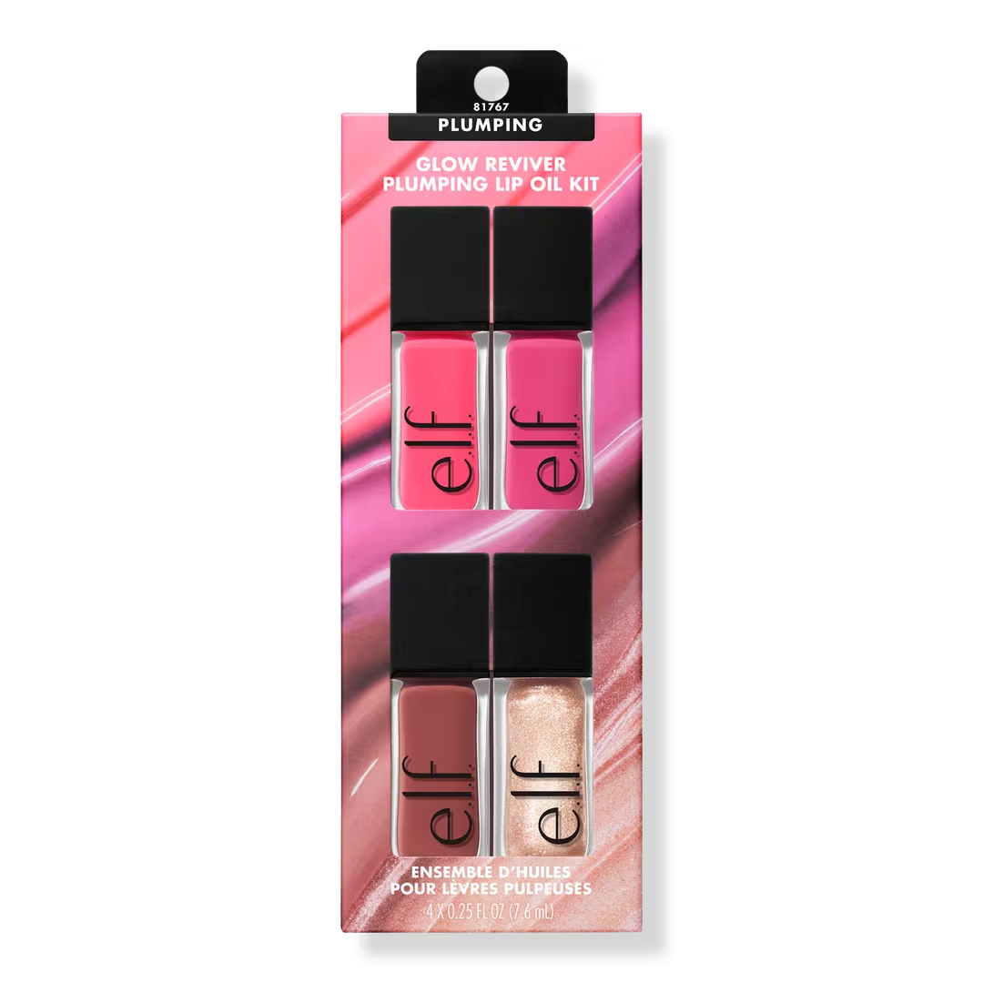 Consigue 4 aceites labiales voluminizadores Glow Reviver de e.l.f. Cosmetics en un kit imprescindible, ¡con 2 tonos exclusivos que no encontrarás en ningún otro lugar! Estos aceites labiales voluminizadores y con efecto hormigueo bañan los labios con una capa de color translúcida, con acabados brillantes y luminosos para un look de labios jugosos y realzados.