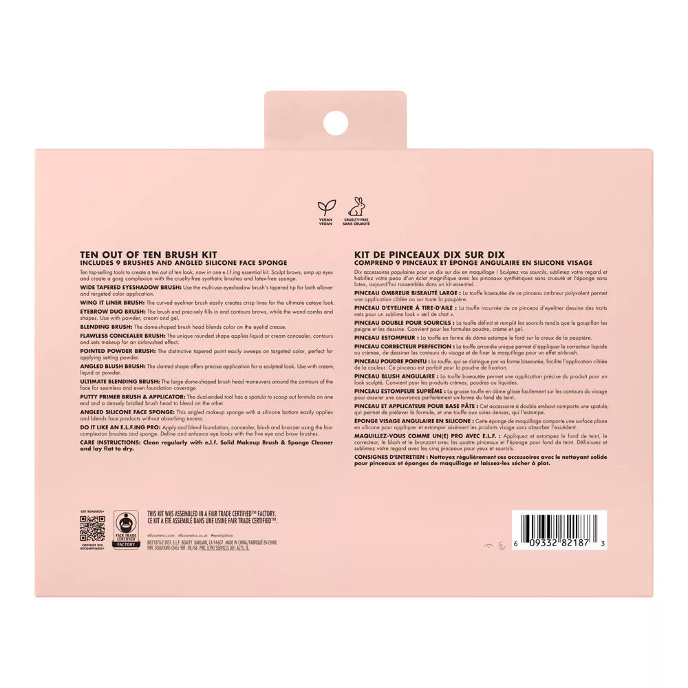 e.l.f.'s Ten Out of Ten Makeup Brush Kit features 10 of their most popular brushes in one kit, perfect for a stunning makeup application. What's included: every brush and face sponge for applying face makeup, sculpting brows, defining your eyes, contouring, and buffing your complexion to perfection.