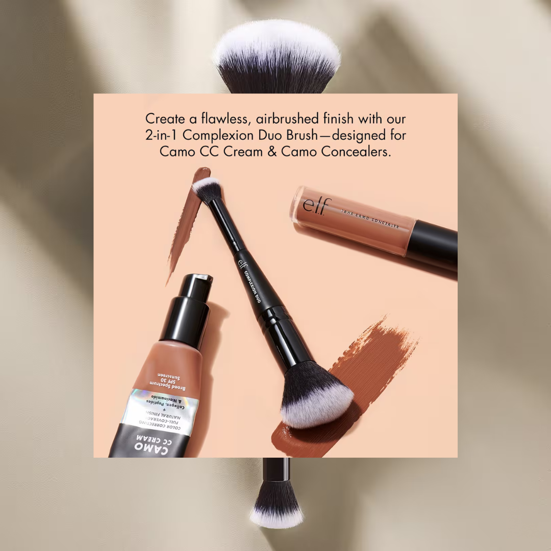 El pincel Complexion Duo de e.l.f. Cosmetics es un pincel 2 en 1 diseñado para aplicar base y corrector.
