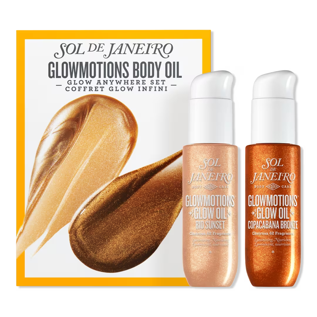 El set de aceites corporales Glowmotions Glow Anywhere de edición limitada de Sol de Janeiro incluye un dúo de aceites corporales Glowmotions en tamaño de viaje en dos acabados transparentes y brillantes.