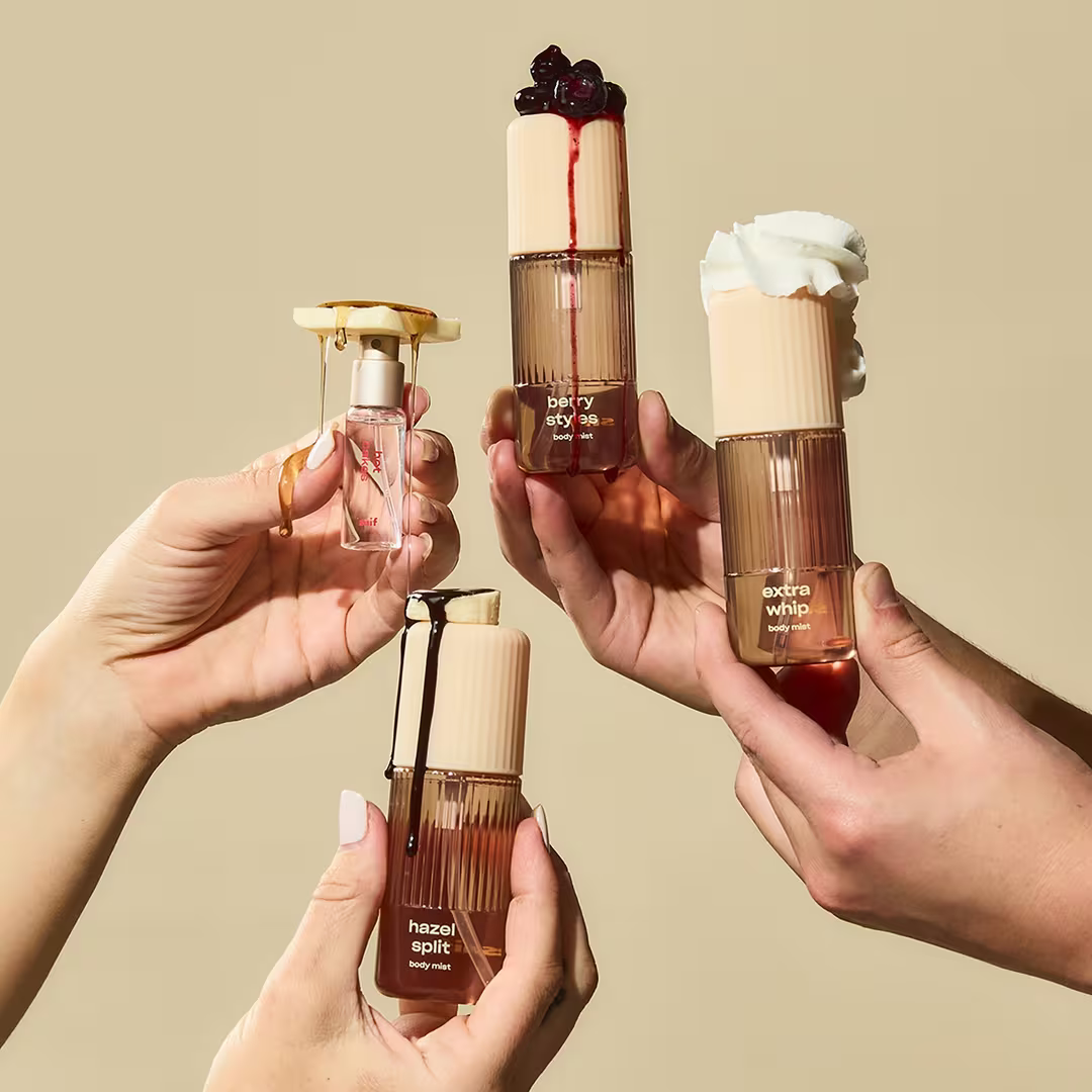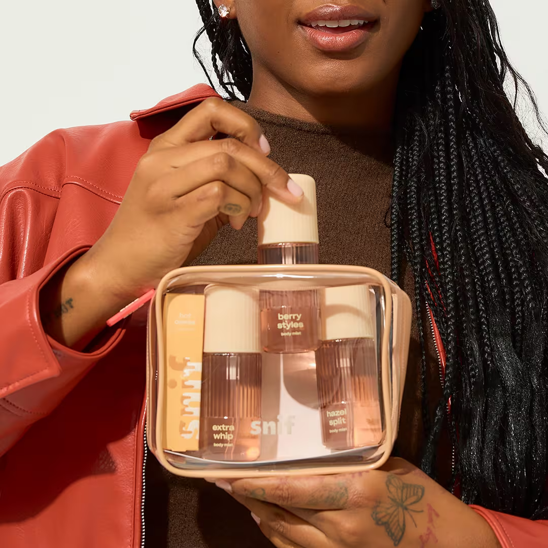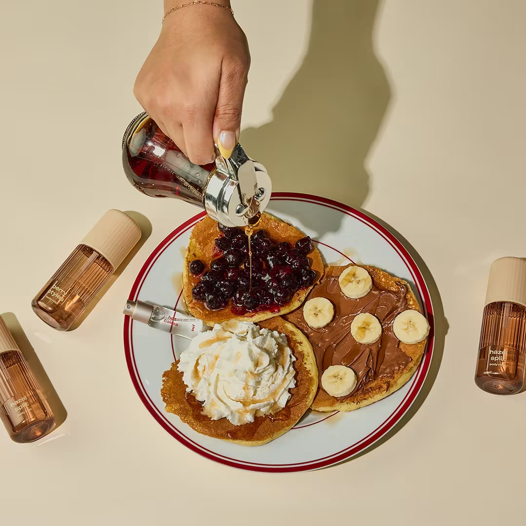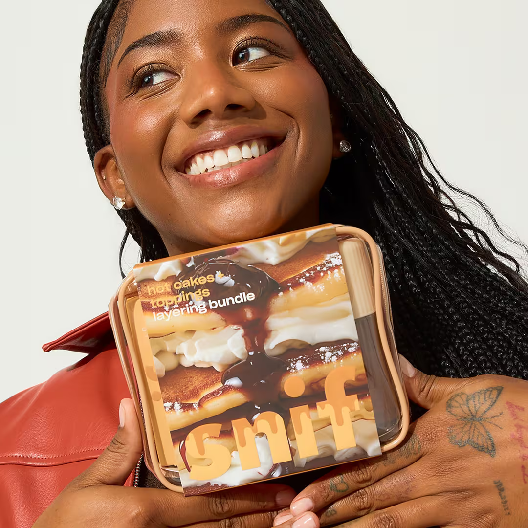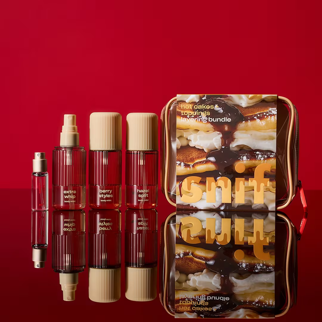 El paquete de capas Snif Hot Cakes + Toppings incluye una suave fragancia a tortita con tres brumas corporales. Completa el aroma a tortitas con la cremosa bruma de vainilla de Extra Whip, el cacao lechoso de Hazel's Split o la mermelada de arándanos de Berry Styles (o una atrevida combinación de las tres).