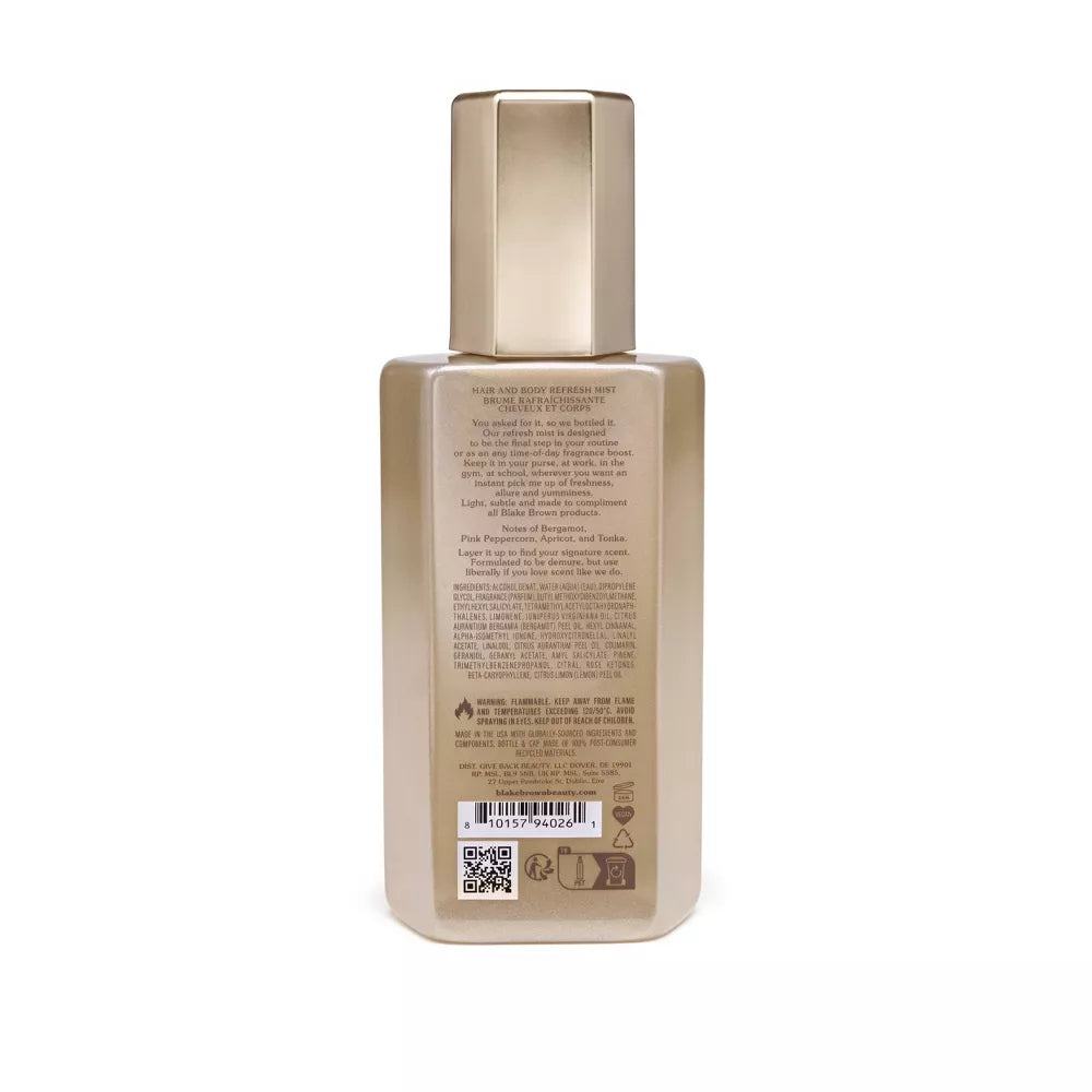 La Bruma Refrescante para Cabello y Cuerpo de Blake Brown está diseñada para ser el último paso de tu rutina o como un extra de fragancia para cualquier momento del día. Llévala en el bolso, en el cajón del trabajo, en el gimnasio, en la escuela, donde quieras un toque instantáneo de frescura, encanto y exquisitez.