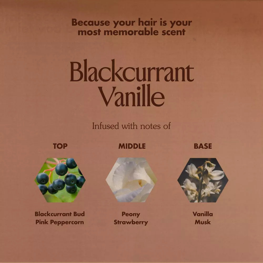 Blackcurrant Vanille está enriquecido con notas de grosella negra, vainilla, pimienta rosa y peonía. Porque tu cabello es tu aroma más memorable.
