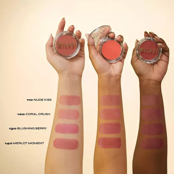 El rubor en crema Milani Cheek Kiss se mezcla a la perfección para lograr un brillo enrojecido. Esta fórmula de crema de bálsamo a gel se funde sobre la piel para brindar un baño de color luminoso.