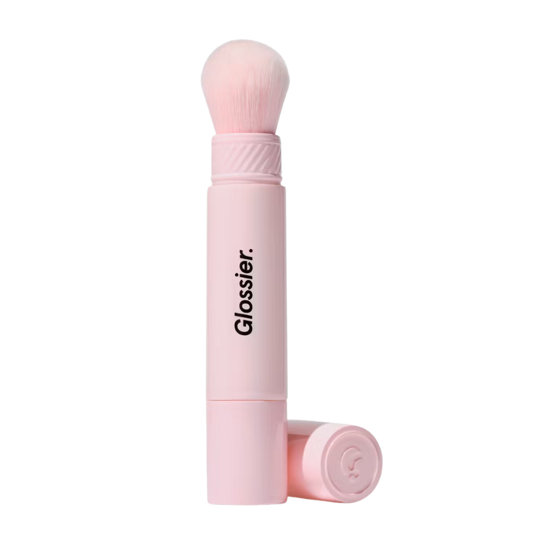 Una brocha para rubor de doble punta, fácil de llevar y diseñada para una aplicación uniforme tanto de rubor líquido como de rubor en polvo.