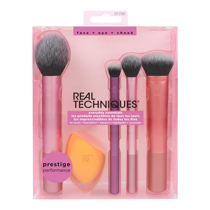 El conjunto Real Techniques Everyday Essentials de 5 piezas es ideal para looks de estilo profesional. Úselo con base, corrector, rubor, iluminador y maquillaje de sombra.