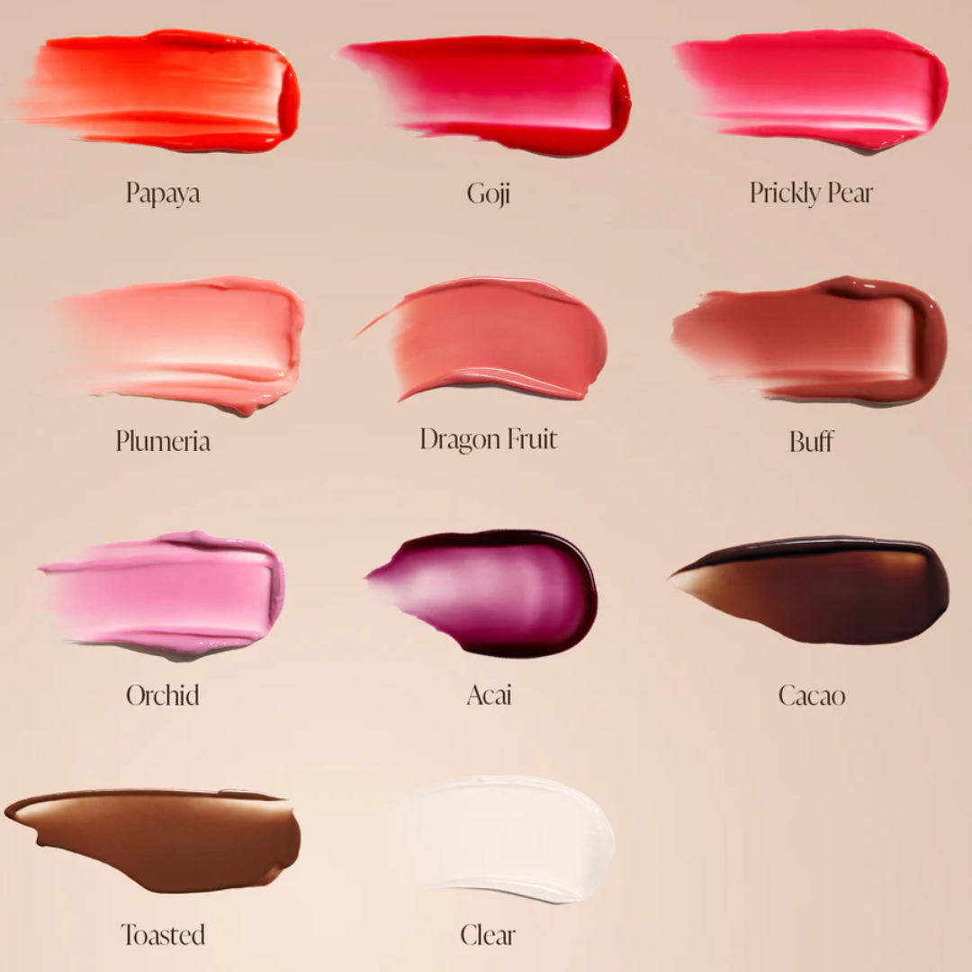Formulado con aceite de coco, murumuru, manteca de karité y ésteres de origen vegetal, este bálsamo de aceite nutre e hidrata los labios secos con un brillo sutil.