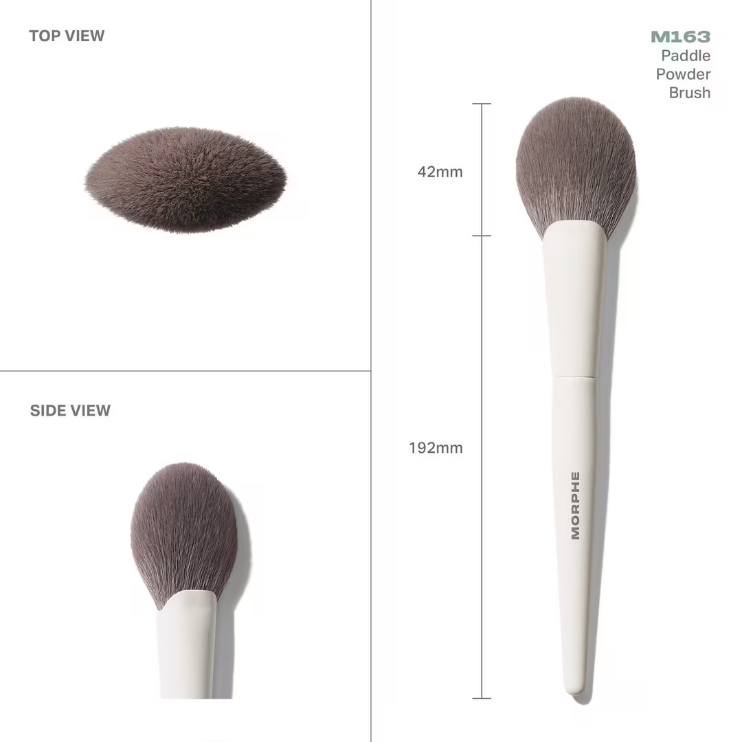 La brocha plana para polvos M163 de Morphe tiene una punta larga, esponjosa y flexible. Esta punta aplica el polvo de forma suave y uniforme y luego retira el exceso, evitando que te excedas. ¿El resultado? Un acabado suave y difuminado. Úsala para fijar o para perfeccionar con base en polvo.