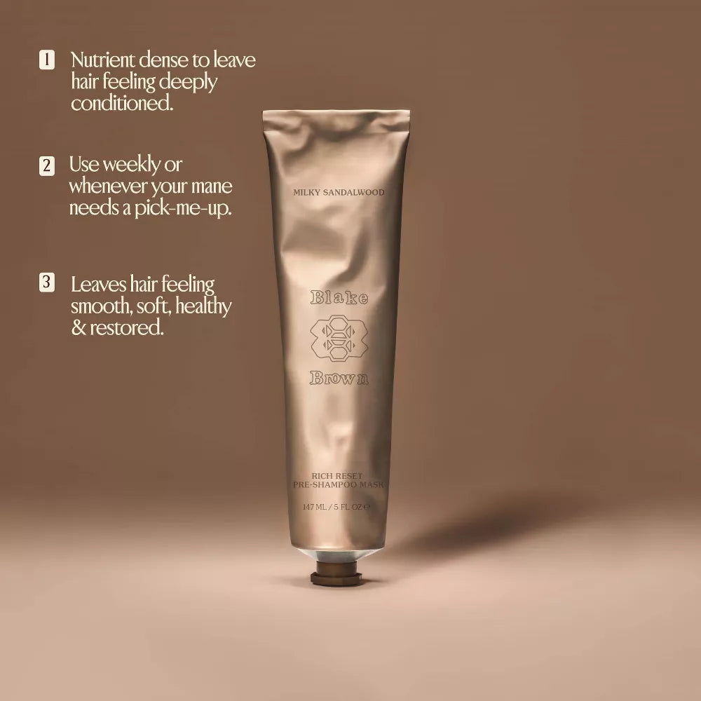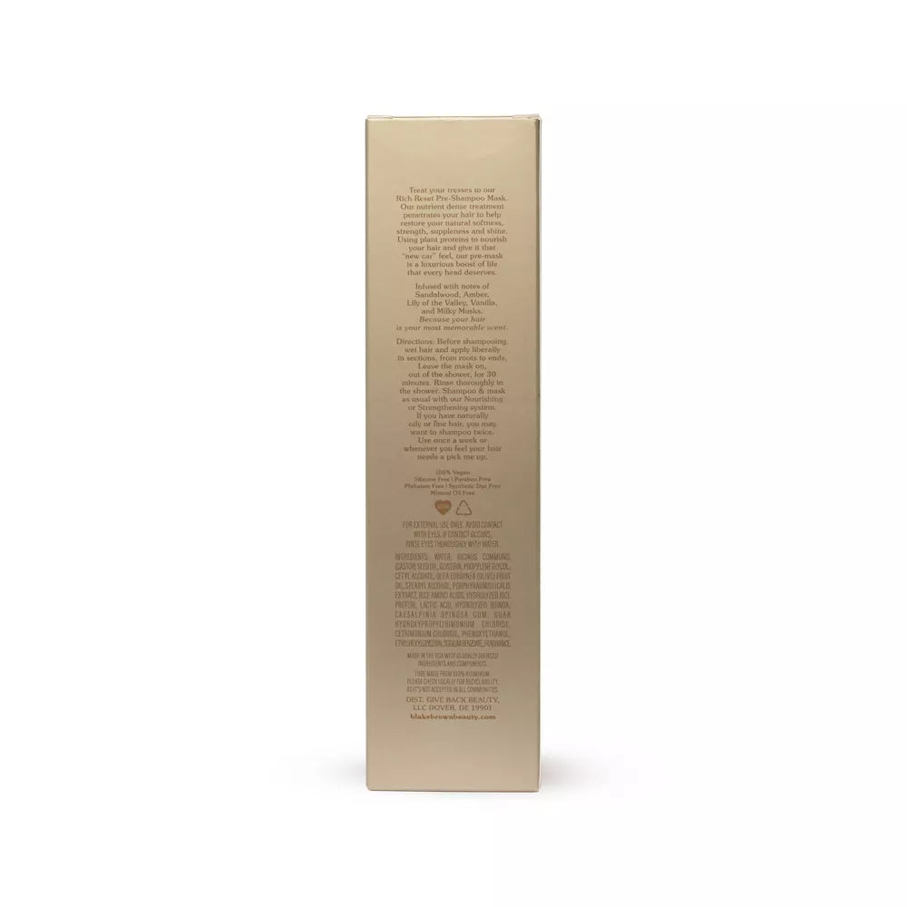 Mima tu cabello con nuestra mascarilla pre-champú Rich Reset. Nuestro tratamiento rico en nutrientes penetra en tu cabello para ayudar a restaurar su suavidad, flexibilidad y brillo naturales. Utilizando proteínas vegetales para nutrir tu cabello y darle esa sensación de "auto nuevo", nuestra mascarilla previa es un lujoso impulso de vida que toda cabeza merece.