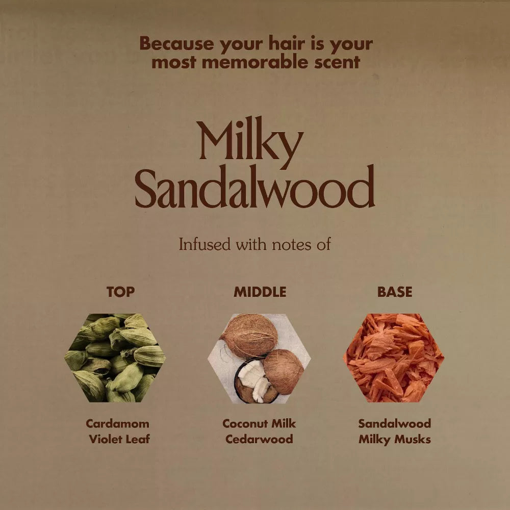 Milky Sandalwood está enriquecido con notas de sándalo, ámbar, lirio de los valles, vainilla y almizcles lechosos. Porque tu cabello es tu aroma más memorable.