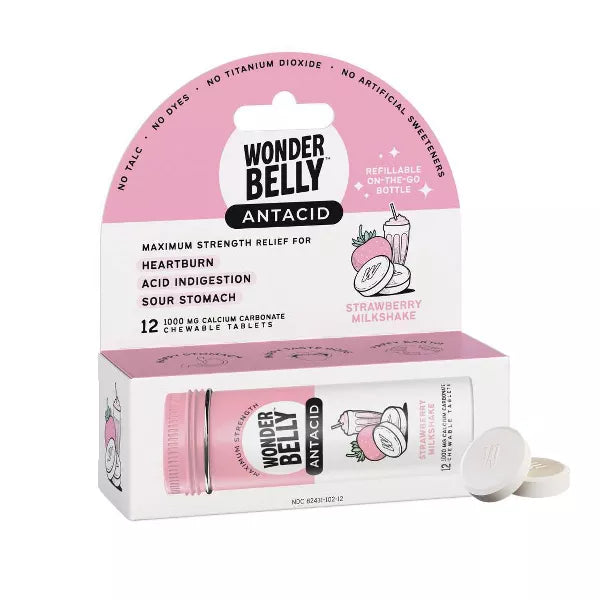 MÁXIMA POTENCIA Y ALIVIO RÁPIDO: Los comprimidos de Wonderbelly Antiácido proporcionan máxima potencia y un rápido alivio de la acidez estomacal y el malestar estomacal relacionado con un gran sabor, ingredientes eficaces y un envase sostenible. Dentro de cada frasco reciclable, encontrarás 12 comprimidos masticables con sabor a batido de fresa, cada uno de los cuales contiene 1000 mg de carbonato de calcio.