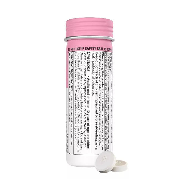 PRÁCTICO ENVASE PARA LLEVAR A DONDE QUIERAS: Nuestros prácticos frascos reciclables para llevar contienen 12 comprimidos y caben en tu bolsillo, para que puedas disfrutar de un rápido y sabroso alivio de la acidez estomacal dondequiera que vayas.