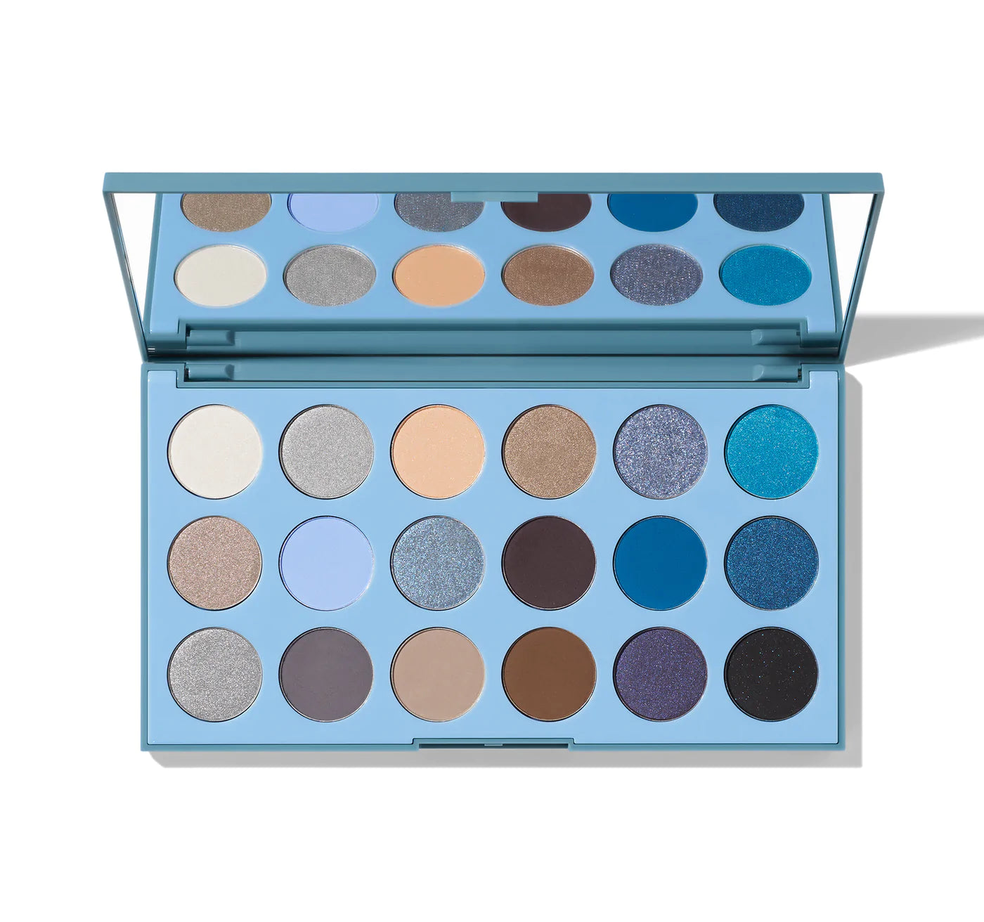 Morphe Blue Ya Away Eyeshadow Palette es una paleta de sombras entre una variedad de azules y colores neutrales. Con diferentes estilos de acabados entre mate y metalicos.