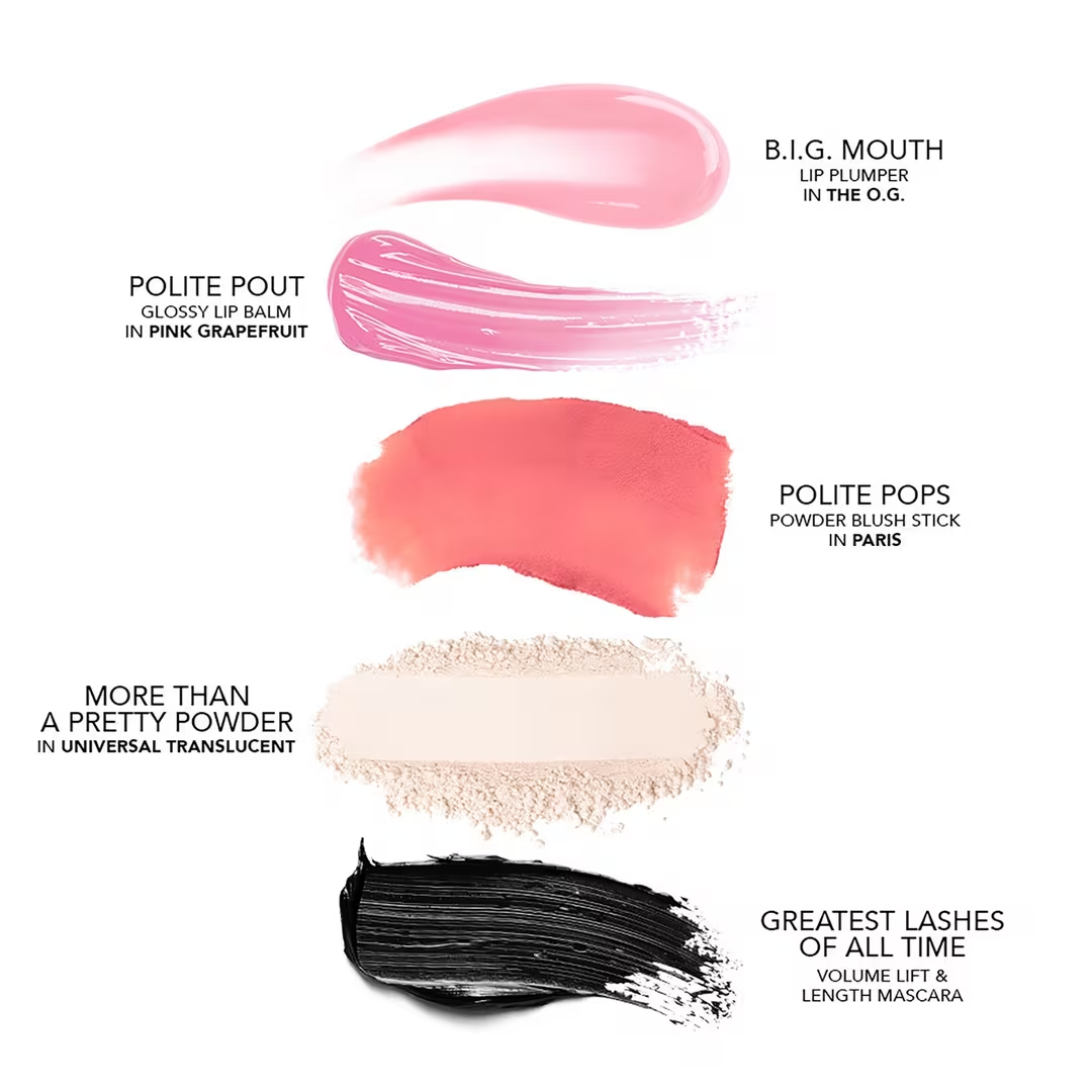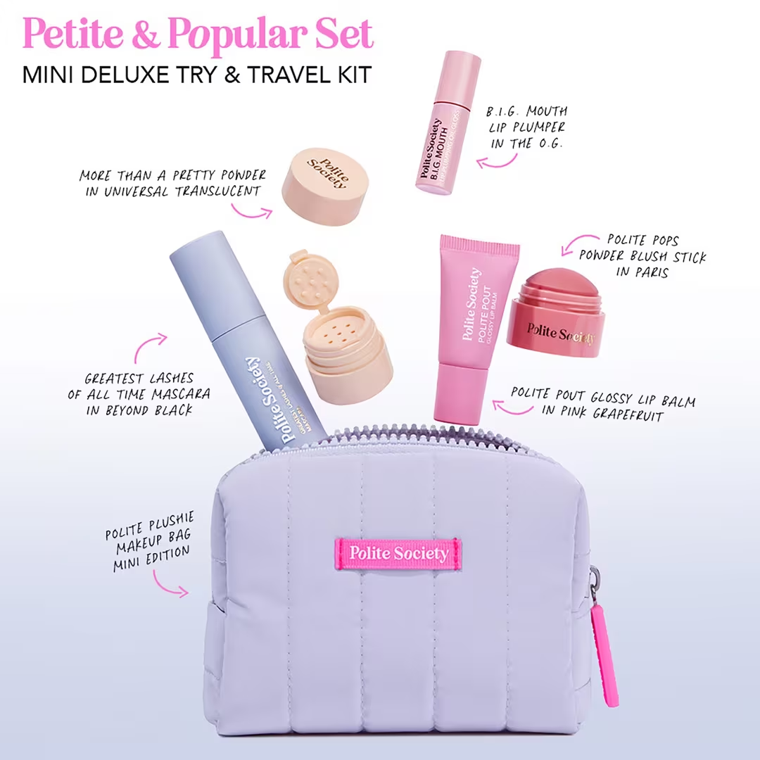 El set Petite & Popular de Polite Society incluye adorables versiones en tamaño mini de sus productos más queridos, todos guardados dentro de una mini edición de su característica bolsa de maquillaje de peluche Polite.
