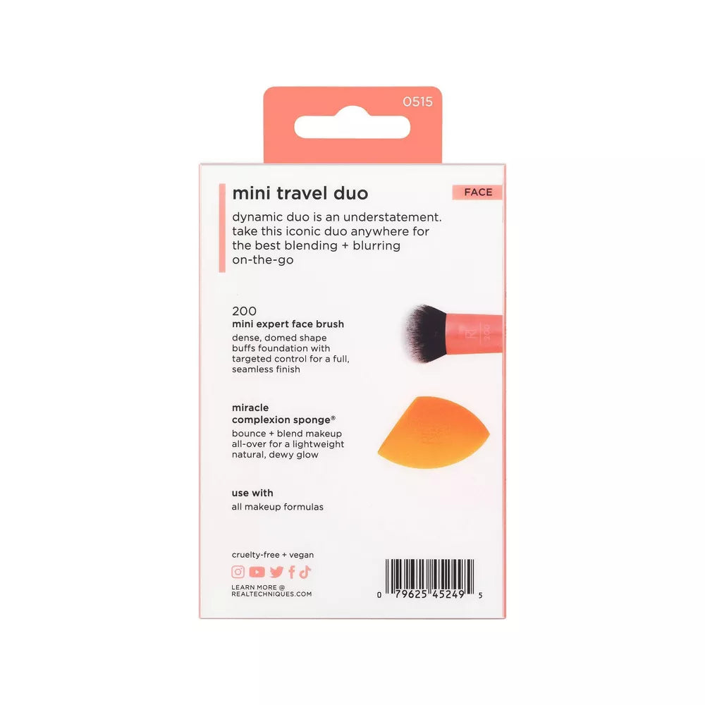 El Mini Dúo de Viaje de Real Techniques incluye dos herramientas de maquillaje esenciales para difuminar y difuminar en cualquier lugar. Estos dos productos más vendidos conforman el pack de inicio perfecto para RT, tanto para principiantes como para profesionales. El set de brochas y esponjas de maquillaje incluye nuestra brocha facial 200 Mini Expert y la esponja Miracle Complexion. La mini brocha facial aplica bases líquidas y en crema con precisión para un acabado uniforme y completo. Nuestra esponja difuminadora de maquillaje proporciona un acabado natural y húmedo para una base uniforme con una cobertura de ligera a media. La esponja de belleza funciona mejor con productos de maquillaje líquidos y en crema, como bases, tintes de piel e iluminadores. Además, cuenta con la exclusiva técnica de aplicación de 3 puntos de RT, que permite difuminar los productos con facilidad. Primero, usa el borde plano para aplicar y cubrir, luego la punta de precisión para disimular y perfeccionar, y finalmente, difumina con el lado redondeado. Como siempre, la brocha facial Expert está hecha con cerdas UltraPlush de alta calidad para una máxima absorción y aplicación. Para que tus herramientas duren más, te recomendamos limpiar tus brochas y esponjas una vez a la semana con el gel limpiador para brochas y esponjas Real Techniques. Al igual que todos nuestros productos RT, esta brocha y esponja de maquillaje son 100 % libres de crueldad animal, veganas y están diseñadas con una revolucionaria tecnología de espuma sin látex.