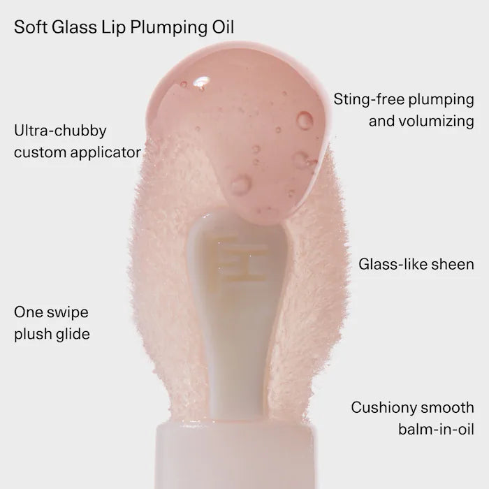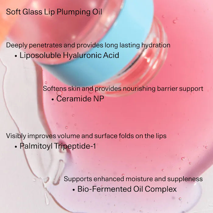 Un bálsamo en aceite híbrido, transparente, con textura de vidrio y ultra suave, con máxima hidratación y visibles propiedades voluminizadoras que suavizan y amplifican los labios.