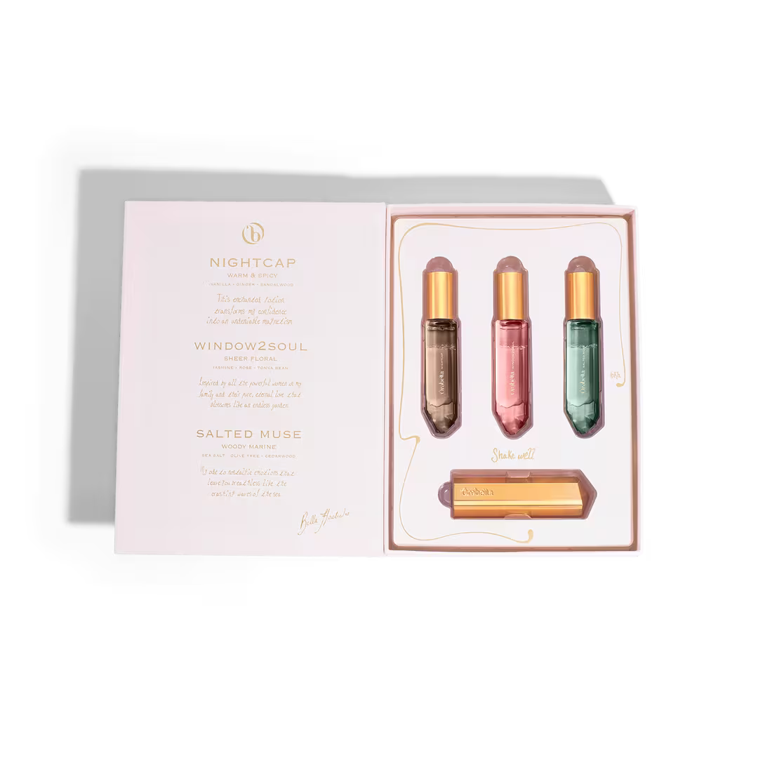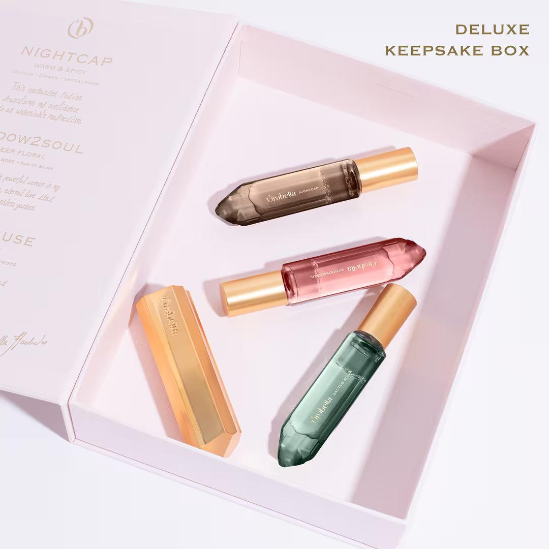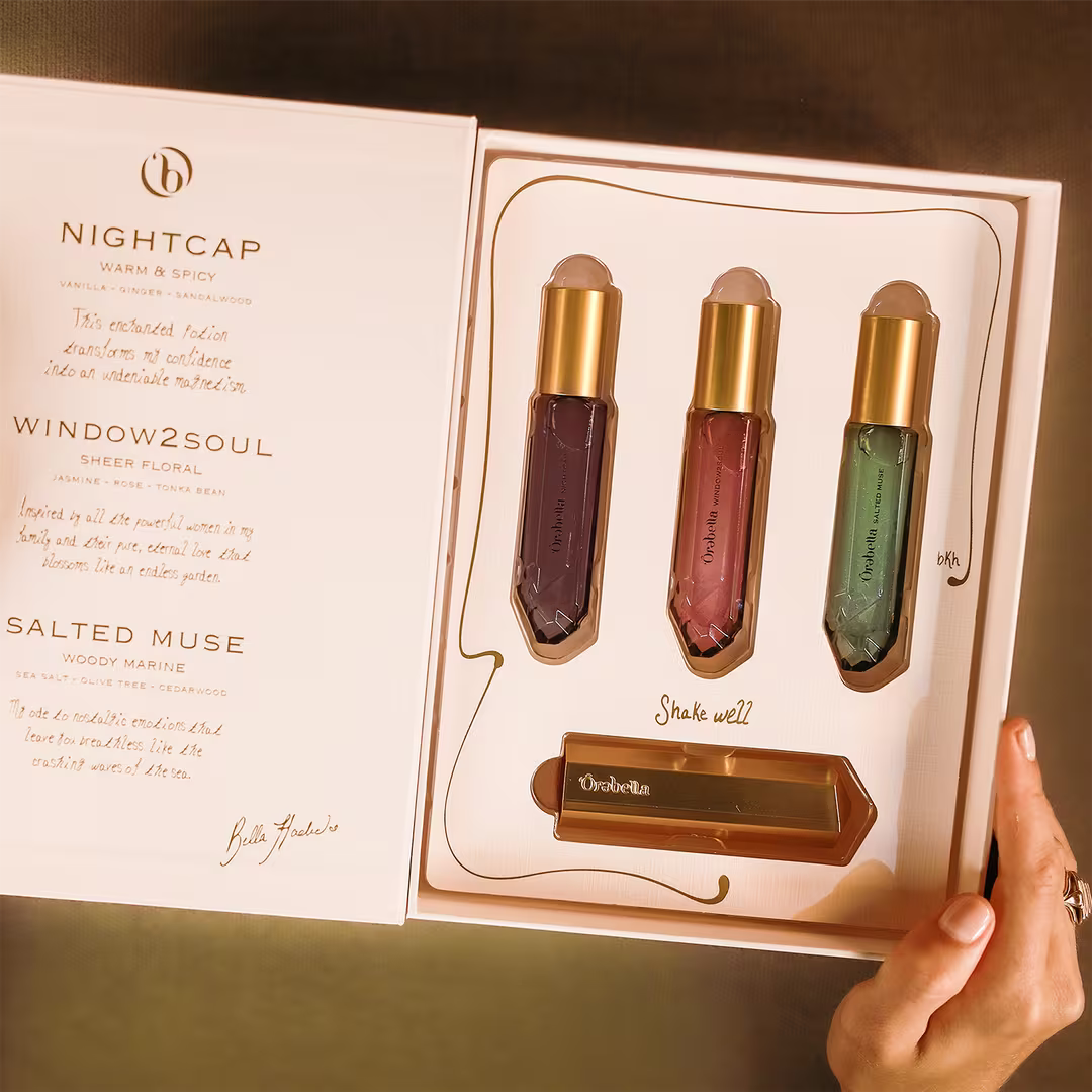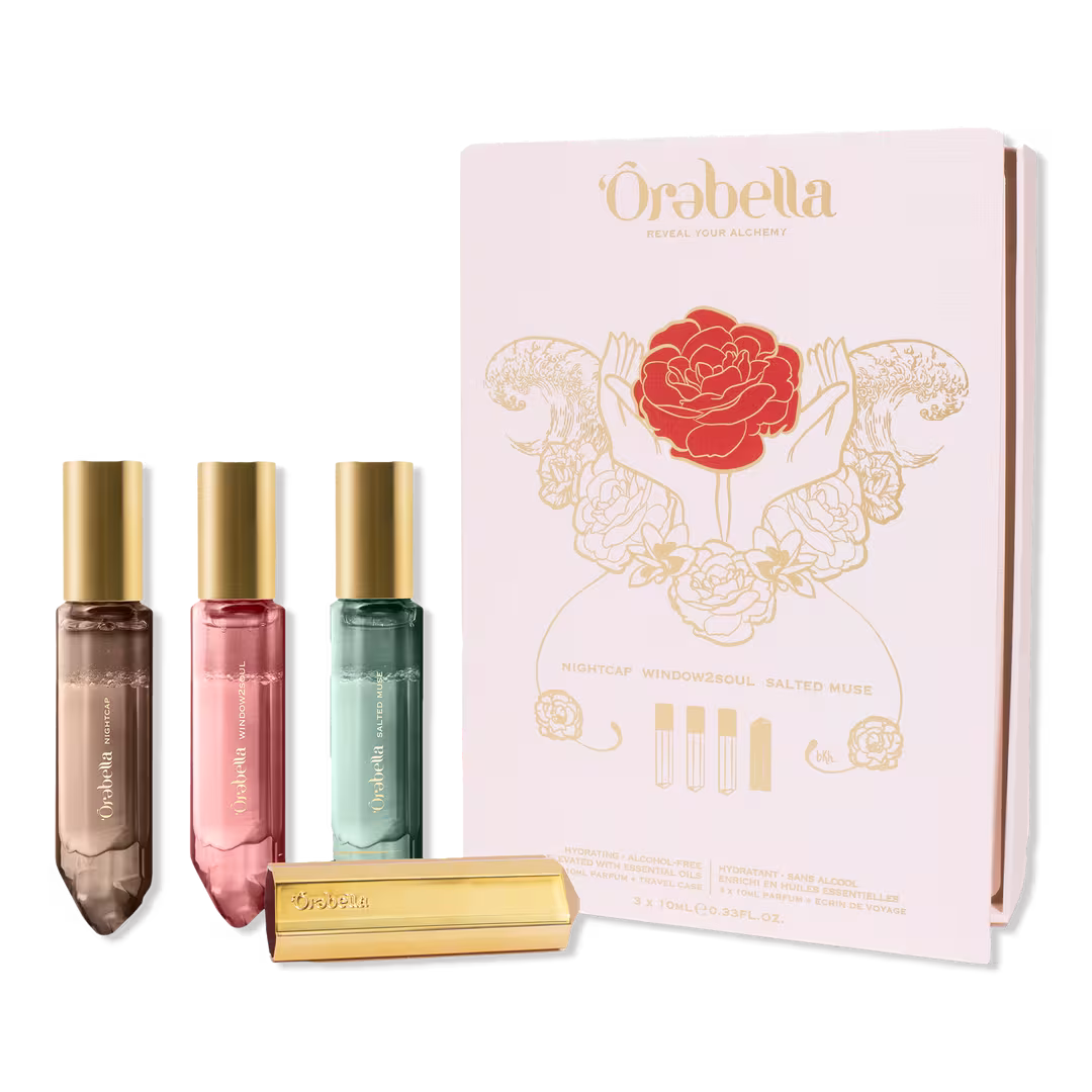 Comparte la alquimia. El set de viaje Trio Travel Set de edición limitada de Ôrəbella te ofrece una muestra de su colección de perfumes para la piel: NIGHTCAP cálido y picante, WINDOW2SOUL floral puro, SALTED MUSE marino amaderado, todo en un tamaño de 0,33 oz. Además, incluye un ESTUCHE DE VIAJE dorado para llevar tus joyas a donde vayas.