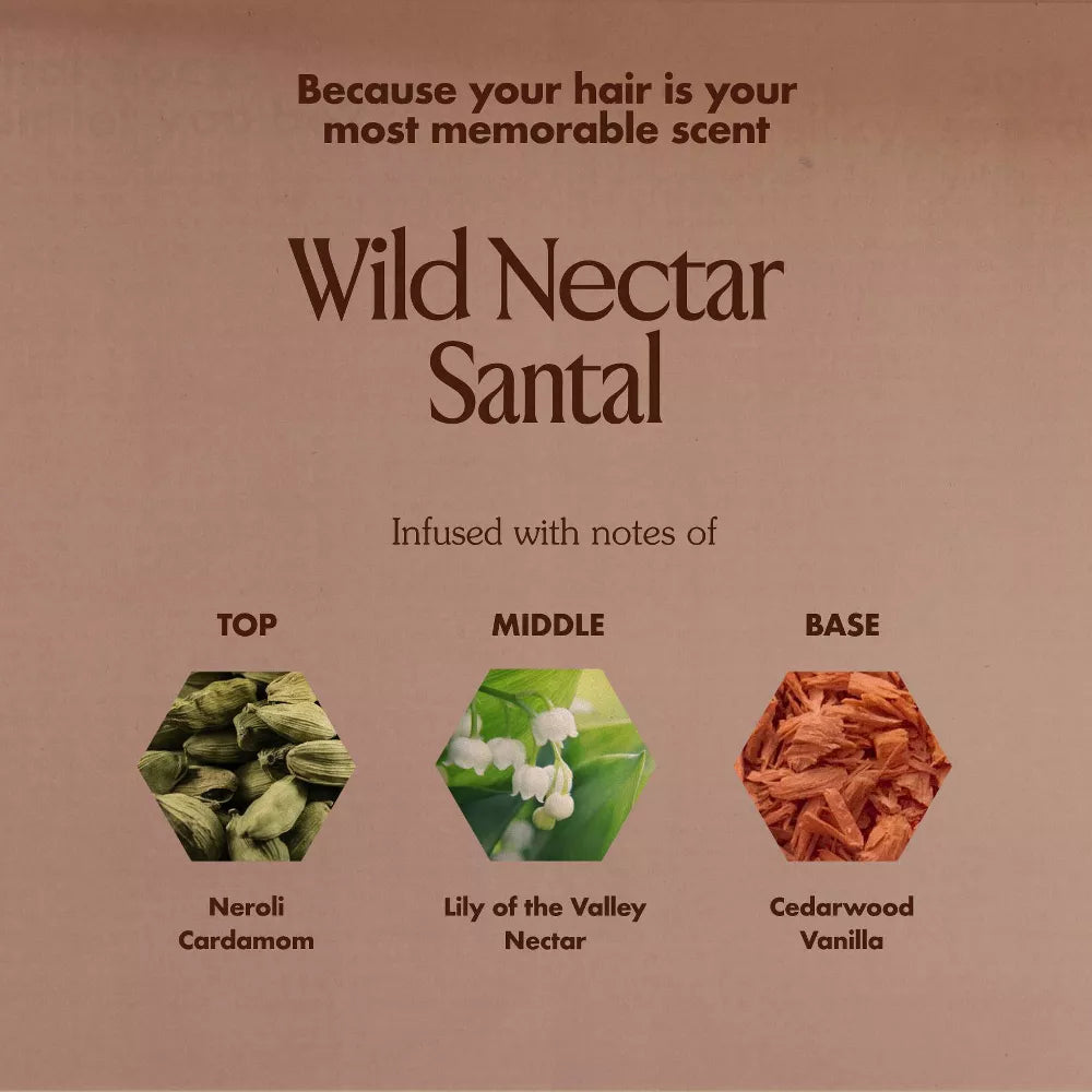 Nuestra fragancia Wild Nectar Santal está impregnada de notas de bergamota, higo, cardamomo y sándalo. Porque tu cabello es tu aroma más memorable.